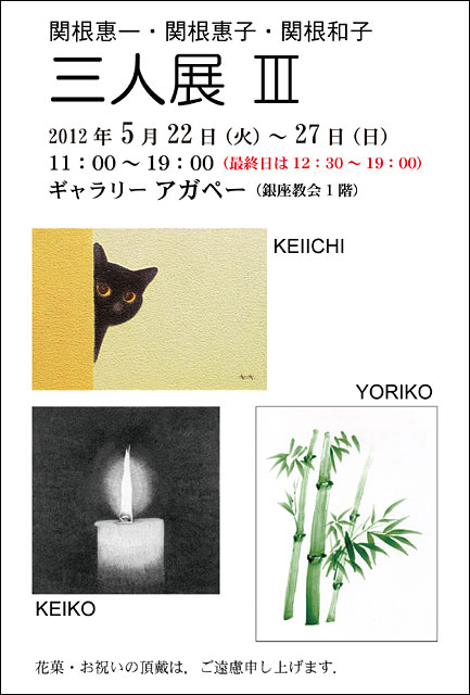 ギャラリー・アガペーで、関根恵一・恵子・和子 三人展Ⅲでが行われます。