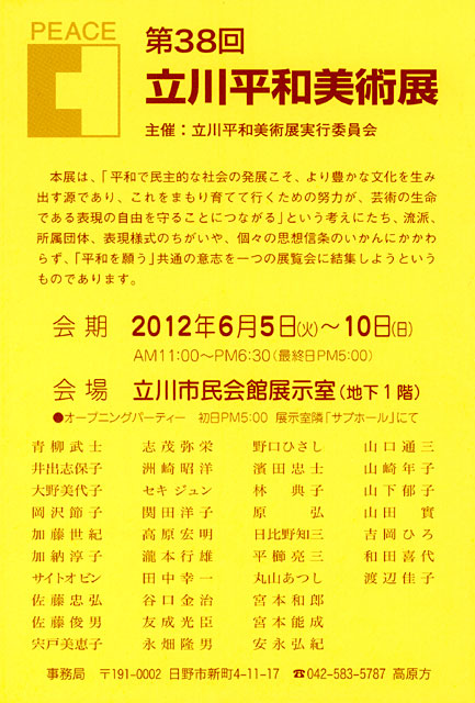 立川市民会館展示室で、第38回立川平和美術展が行われます。